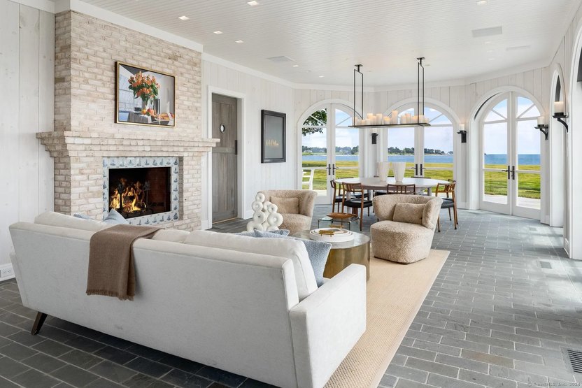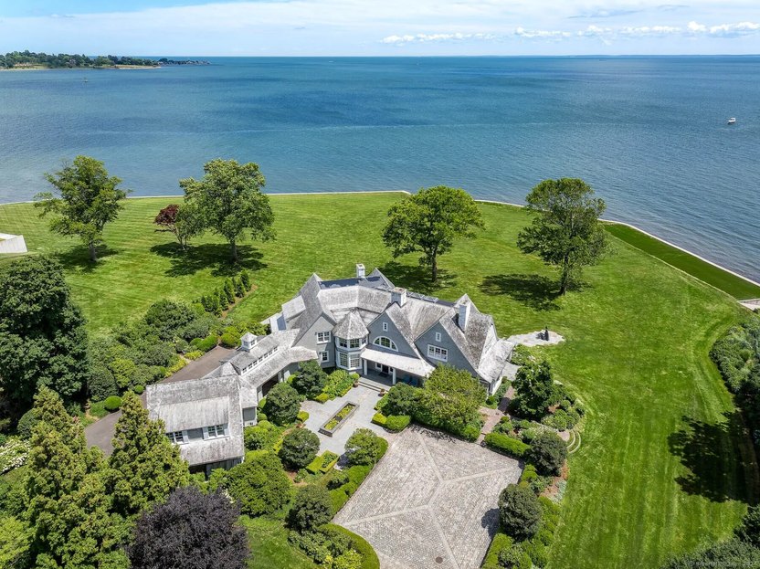The fabulous 6.6-acre estate overlooks the Long Island Sound and features 10,544 square feet of living space, including five bedrooms and 5.5 baths.
