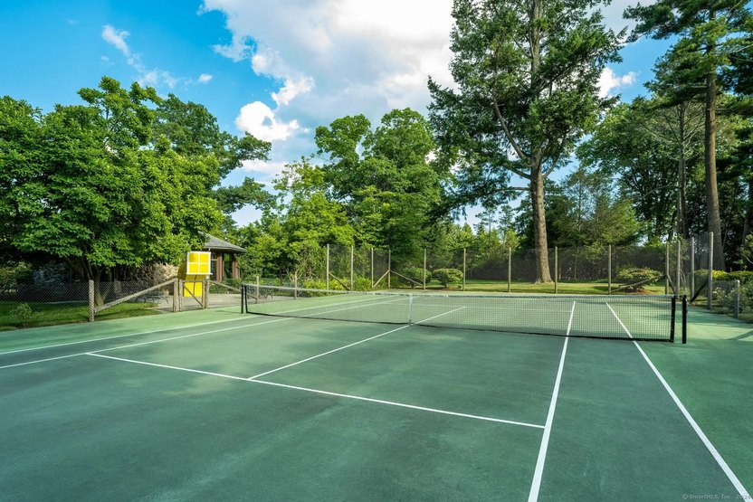 Among the other bedrooms are two with multiple rooms and two with their own bath and entry hall. Outside, the waterfront property includes a tennis court and pavilion. There are four garages, storage, a catering prep room, and a basement with “hotel-level” laundry facilities.