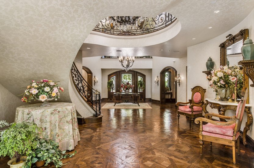 Done up in a French chateau style, the palatial property sits on 10 acres within the gated Calabasas enclave of Cold Creek Estates, and includes serene, parklike grounds.