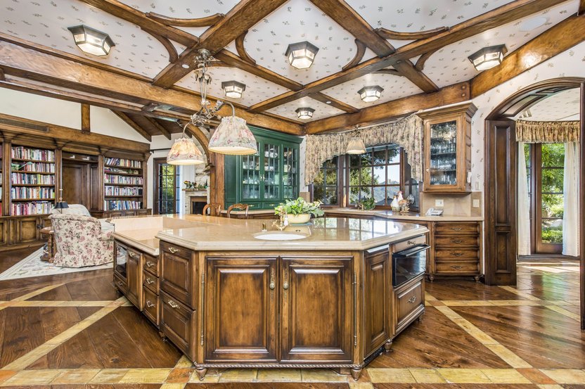 The kitchen has a La Cornue range, along with a breakfast bar and two walk-in pantries. The kitchen sits adjacent to a breakfast nook and a cozy den with a fireplace.